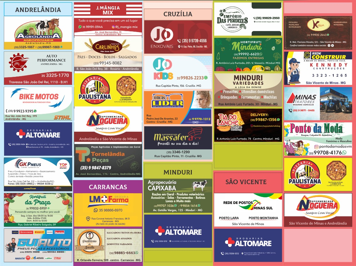 ANDRELÂNDIA – AGROPECUÁRIA AGROLÂNDIA, BIKE MOTOS, DROGARIA REDE ALTOMARE, G.K. PNEUS, GUIAUTO PNEUS PEÇAS E ACESSÓRIOS, J. MÂNGIA MIX, OFICINA AUTO PERFORMANCE, PADARIA DO CARLINHOS, HORTIFRUTI DA PRAÇA, PIZZARIA PAULISTANA, SUPERMERCADO NOGUEIRA E TORNELÂNDIA PEÇAS;